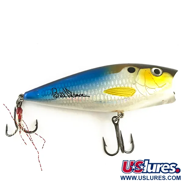 De handtekening van de legendarische visser Bill Dance prijkt op de blauw getinte flank van dit topwater exemplaar. Met een lengte van 8 cm (3 1/4") maakt het kunstaas gebruik van een holle mond om water te verplaatsen op het wateroppervlak (0 m). Een gewicht van 12,5 g (2/5 oz) zorgt voor stabiliteit bij verre worpen naar structuren. In het Threadfin Shad kleurenschema reflecteert een holografische afwerking het licht via de zilveren zijden met schubpatroon, terwijl een gele keel een subtiel contrast toevoegt. Op de witte buik is de code 6482 gekoppeld aan de duidelijk gedrukte 'Excalibur POP'N IMAGE' branding. De achterste dreg is voorzien van rode en witte veren om aanbeten uit te lokken wanneer het kunstaas stil ligt. Dit specifieke item verkeert in uitstekende staat met een waardering van 5/5.
