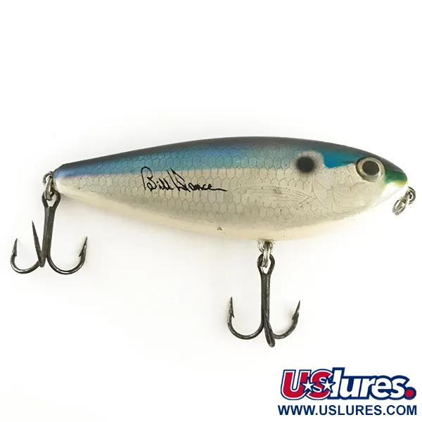 Een gedetailleerd schubbenpatroon loopt over het 8 cm lange frame van deze klassieker voor het oppervlaktevisvissen, met een diepblauwe rug die overgaat in zilverwitte flanken. De handtekening van Bill Dance is prominent aanwezig naast een kenmerkende zwarte stip, wat dit model identificeert als een signature-serie. Met een gewicht van 13 g draagt het kunstaas productcode 6520 en is het uitgerust met twee robuuste, donker afgewerkte dreggen. Geproduceerd door Heddon onder de Excalibur-lijn, bevat de constructie een intern ratelmechanisme voor extra geluid onder water. Hoewel het primair wordt gebruikt voor oppervlaktetechnieken, is het geschikt voor dieptes tot 0,5 m. De 5/5 conditie blijkt uit de scherpte van de "Excalibur SPIT'N IMAGE" bedrukking op de schouder en de strakke afwerking van de body. Een groot, realistisch oog met een gouden iris vormt een focuspunt bij het voorste bevestigingsoog.