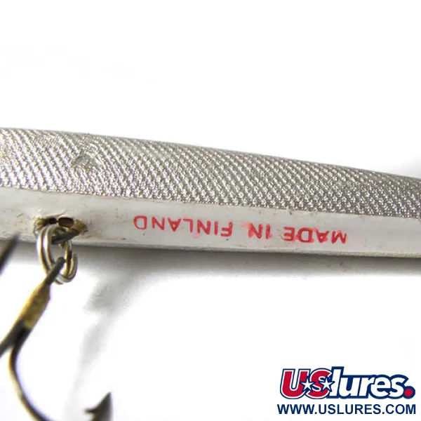 Een natuurlijk schubpatroon siert de volledige lengte van deze 12 cm (4 3/4") minnow, waardoor het licht wordt weerkaatst als bij een echte aasvis. Op de buik staat een duidelijk „MADE IN FINLAND” stempel in rode inkt, wat direct de ambacht van Finlandia Uistin onderstreept. Dit exemplaar, met productcode 0216, heeft een donkergrijze rug die scherp contrasteert met de zilveren flanken en een klein rood accent bij de bek. Met een gewicht van 6 g (3/16 oz) is de plug uitgerust met een heldere, ondiep duikende lip, geschikt voor werpen of trollen in de bovenste waterlagen. Het beslag is in uitstekende staat, waarbij de originele dreggehaken bijdragen aan een conditiescore van 4/5. Het slanke profiel en de authentieke Finse constructie maken dit een waardevolle toevoeging aan een verzameling Europese kunstaasjes.