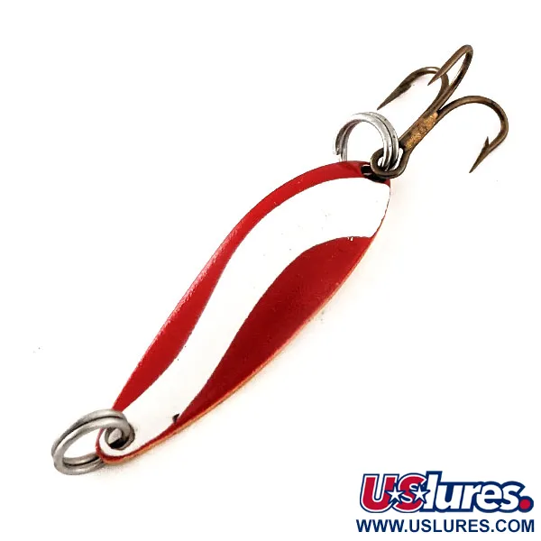 Rood-witte geëmailleerde golven sieren de voorzijde van deze 3,5 cm (1 1/2") lepel, wat contrasteert met de gepolijste goudkleurige achterzijde waar de 'Fiord Jr' stempel scherp en leesbaar is. Met een conditiescore 6 is het kunstaas ongebruikt en heeft het de schone, heldere uitstraling waar verzamelaars van vintage Amerikaans metaal naar zoeken. Met productcode 11975 weegt de lepel 3,4 g (1/8 oz) en is het een veelzijdige keuze voor zowel werpen als jiggen. De montage bestaat uit een robuuste bronzen dreg bevestigd via een splitring, wat de eenvoudige en effectieve bouwwijze weerspiegelt waar Acme om bekend stond voordat dit model uit productie ging. Een tweede splitring bij de kop dient als het primaire bevestigingspunt voor deze klassieke in de VS gemaakte lepel.