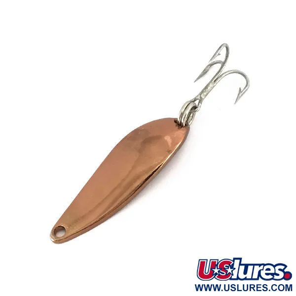 Kopertonen domineren de afwerking van deze klassieker van Amerikaanse makelij, een kleurkeuze die vaak de voorkeur geniet vanwege de zichtbaarheid in troebel water of op bewolkte dagen. Met een gewicht van slechts 1/8 oz (3,4 g) is de Acme Fiord Spoon Jr, herkenbaar aan productcode 7787, een gespecialiseerd hulpmiddel voor werpen of verticaal jiggen bij het vissen op schuwe roofvissen. Het metalen lichaam van 1 1/2" (3,5 cm) heeft een opvallend langgerekt profiel dat verzamelaars zullen herkennen als een vintage Acme-ontwerp, dat inmiddels niet meer wordt geproduceerd. Wanneer het kunstaas wordt omgedraaid, wordt het "FIORD Jr."-stempel op de holle zijde zichtbaar, strak in het koperoppervlak geperst. Dit specifieke exemplaar verkeert in uitstekende staat (5/5), waarbij de metalen afwerking en de hardware glanzend zijn gebleven. Een enkele splitring verbindt de scherpe dreg met de staart, terwijl het kleine oogje aan de taps toelopende neus vrij is van obstructies.