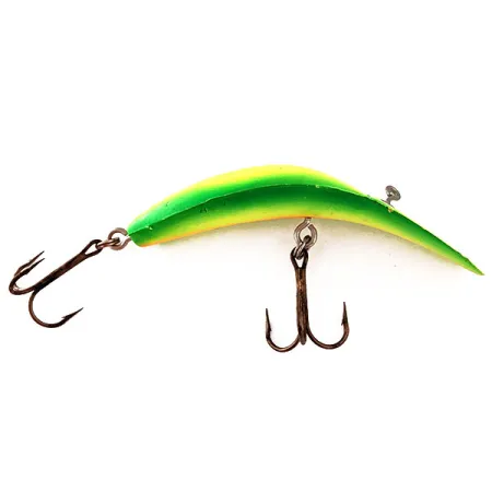 Een opvallende Chartreuse / Oranje / Groen afwerking kenmerkt deze klassieker van Yakima Bait, waardoor het een blikvanger is in elke tacklebox. Deze Flatfish M2, geregistreerd onder productcode 11361, heeft een indrukwekkende lengte van 11 cm en een gewicht van 17 g. Bij het bekijken van de hardware vindt u twee scherpe dreggen die zijn bevestigd aan stevige metalen ogen, wat getuigt van de robuuste constructie waar Yakima Bait om bekend staat. De staat van dit specifieke kunstaas is een indrukwekkende 5/5, met een goed bewaard gebleven oppervlak en schone metalen onderdelen. Sportvissers verkiezen historisch gezien de M2-maat vanwege de veelzijdigheid bij het vissen op grotere zoetwatersoorten zoals snoek of meerforel. Het kenmerkende banaanvormige lichaam is uitgerust met een schroefoog-bevestiging aan de bovenzijde, gepositioneerd voor maximale effectiviteit tijdens langzaam slepend vissen of een gestage inhaalbeweging. Het lakwerk heeft een fel geelgroene rug en buik die een diep bosgroene middensectie omlijsten, geaccentueerd met oranje highlights. Dit exemplaar weerspiegelt de productienormen uit de VS en toont de duurzame afwerking die de Flatfish al meer dan tachtig jaar tot een favoriet maakt.