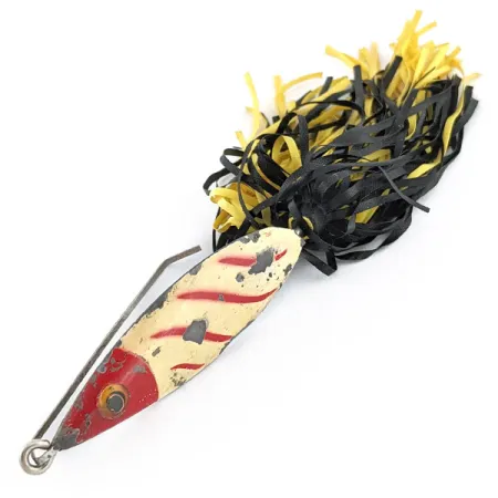 Met een lengte van 6 cm (2 1/4") heeft de lepelvormige body van dit kunstaas een rode kop die overgaat in een crèmekleurig middengedeelte, geaccentueerd door rode horizontale strepen. Diep in de metalen onderzijde zijn de naam Fred Arbogast en de Hawaiian-aanduiding gestanst, wat de Amerikaanse herkomst bevestigt. Deze Fred Arbogast #3 Hawaiian heeft productcode 23276 en weegt een solide 16g (3/5oz), waardoor hij uitermate geschikt is voor gerichte werptechnieken. Dit exemplaar verkeert in conditie 4/5, met wat licht lakverlies op de body en de kop dat getuigt van de ouderdom zonder de algehele uitstraling te schaden. Aan de achterzijde is een dikke, tweekleurige skirt van zwarte en gele rubberen slierten bevestigd, vastgezet nabij de enkele haak. Een stijve metalen weedguard loopt van het oog naar de haakpunt om vastlopen in onderwatervegetatie te voorkomen. Het rode gedeelte van de kop is afgewerkt met een eenvoudig geschilderd oogdetail.
