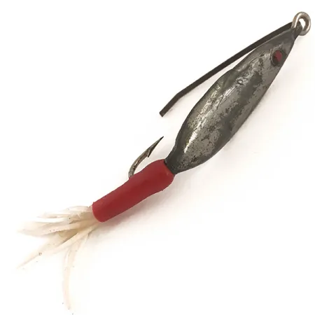 Met een gewicht van 8g (1/4oz) is de zware loden body van deze Hawaiian #3 specifiek ontworpen om door dichte vegetatie heen te dringen. Dit exemplaar, herkenbaar aan productcode 4743, is voorzien van de originele metalen weedguard die vanaf het bevestigingsoog naar achteren over de haakpunt buigt om vastlopen in dichte begroeiing te voorkomen. Een opvallende rode huls bedekt de haaksteel, wat een scherp contrast vormt met de zilverkleurige body en overgaat in een bundel witte rubberen slierten. Met een lengte van 4,5 cm (1 3/4") heeft het kunstaas zijn originele roodgeverfde oog bij de neus en het ingeslagen merklogo op de achterzijde behouden. De metallic afwerking vertoont lichte ouderdomssporen, wat een conditiescore van 4/5 oplevert, terwijl de klassieke functionele aantrekkingskracht behouden blijft. Dit in de VS geproduceerde ontwerp weerspiegelt Fred Arbogasts toewijding aan het ontwikkelen van gespecialiseerd kunstaas voor het vissen in dichte lelievelden en tussen takken.