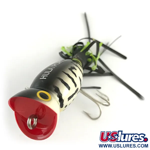 Een opvallend White Tiger-patroon met krachtige zwarte strepen over een strakke crème basis kenmerkt dit exemplaar. Met een gewicht van 1/3 oz (10g) en een lengte van 2 inch (5 cm) beschikt deze Fred Arbogast Hula Popper, bekend onder productcode 6617, over de iconische diepe rode komvormige bek die sinds het debuut van het ontwerp door Arbogast in 1941 een vast onderdeel is van de oppervlaktevisserij. Het originele "Hula"-concept wordt hier vertegenwoordigd door een tweekleurige skirt van zwart en lindegroen rubber, bedoeld om visuele textuur te geven zelfs als het kunstaas stil op het water ligt. Dit specifieke exemplaar verkeert in uitstekende staat (score 5/5), met heldere gele ogen met scherpe zwarte pupillen en goed bewaarde zilveren dreg-haken gemonteerd via surface-plate hardware. De stempel "HULA POPPER" staat duidelijk op de bovenkant van de rug, contrasterend met de verlopende grijs-naar-witte afwerking. De combinatie van de contrastrijke tijgerstrepen en de levendige rode bek maakt dit een topstuk voor elke verzamelaar van mid-century Arbogast kunstaas.