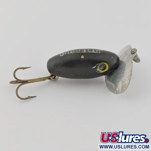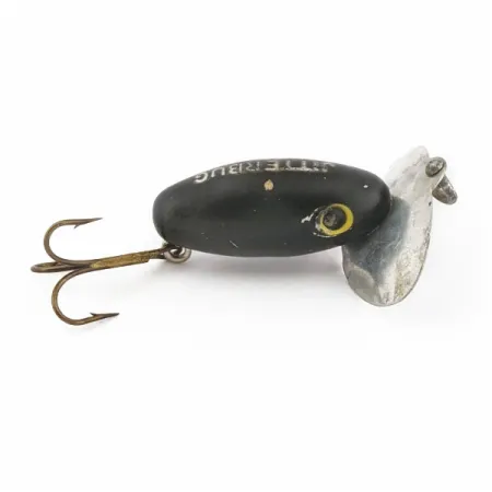 Direct in de metalen lip is de naam JITTERBUG gestempeld, samen met de herkomst Fred Arbogast Akron, Ohio, wat dit identificeert als een authentiek stuk Amerikaans hengelsportmateriaal. Met een diepzwarte afwerking biedt deze 1 1/2" (4 cm) oppervlakteplug het contrastrijke silhouet waar ervaren vissers op vertrouwen bij weinig licht. Het kunstaas weegt 1/8 oz (4 g), waardoor het een specifieke keuze is voor het vissen met licht materiaal op baars en bass in rustig water. De kenmerkende brede, dubbel uitgeholde lip wordt op zijn plaats gehouden door twee originele schroeven en dient als de belangrijkste bron van oppervlakteverstoring. De witte blokletters op de bovenkant van het lichaam blijven goed leesbaar en de geverfde gele ogen vertonen slechts minimale tekenen van slijtage. Beoordeeld met 4/5, is het algehele uiterlijk zeer netjes met slechts lichte oppervlakkige krassen die zichtbaar zijn bij nadere inspectie. Een enkele dreg is bevestigd aan de buikbevestiging, passend bij het compacte profiel van dit model, gecatalogiseerd onder productcode 24507.