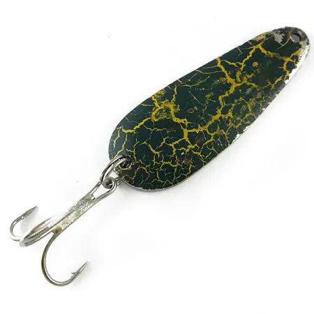 Een opvallend kikkerpatroon met een craquelé-afwerking en gele accenten op een diepgroene basis siert de voorzijde van deze lepel van 9 g (1/3 oz). Met een lengte van 5,5 cm (2 1/4") heeft de metalen body een gepolijste vernikkelde achterzijde waarin de naam "GADABOUT GADDIS" duidelijk in het metaal is gestempeld. Dit exemplaar, met productcode 6246, is een klassieke vertegenwoordiger van Amerikaanse hengelsportuitrusting uit het midden van de vorige eeuw, verbonden met de legendarische "Flying Fisherman". Het kunstaas is uitgerust met een zilverkleurige splitring en een stevige dreg. In de huidige 4/5 staat vertoont het lichte oppervlakkige krassen in de lak, hoewel het nikkel glanzend blijft en de stempeling scherp is. Dit model is ontworpen voor werptechnieken in zoetwater, waar het contrast tussen de donkere bovenkant en de reflecterende onderkant het meest effectief is.