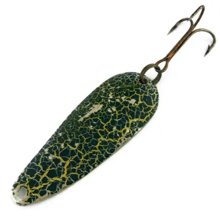In de gepolijste nikkelen onderzijde van deze 5,5 cm (2 1/4") lepel is de legendarische naam "GADABOUT GADDIS" gestempeld, een eerbetoon aan de beroemde "Flying Fisherman" uit het midden van de vorige eeuw. Met een gewicht van 9 g (1/3 oz) toont het kunstaas aan de bolle kant een klassieke Frog-afwerking, met een diepgroene basis en een geelgouden craquelé-textuur. Dit specifieke exemplaar, gecatalogiseerd onder productcode 9482, vertegenwoordigt een kenmerkend tijdperk van in de VS gemaakte visuitrusting. Het beslag is nog origineel, voorzien van een heavy-duty splitring en een scherpe dreg met bronzen afwerking. De conditie wordt beoordeeld als 4/5, met slechts lichte oppervlakkige ouderdomsverschijnselen die de geschiedenis weerspiegelen zonder de integriteit van de verf of het metaal aan te tasten. Deze lepels werden op grote schaal gepopulariseerd door Roscoe "Gadabout" Gaddis tijdens zijn televisiecarrière en zijn ontworpen als veelzijdige tools voor werpen of trollen. De vernikkeling zorgt voor een heldere flits onder de getextureerde verf, een specifiek constructiedetail bedoeld voor visueel contrast in het water.