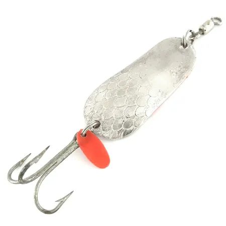 Deze in Canada vervaardigde lepel van 25g (1oz) is voorzien van een opvallend gehamerd schubbenpatroon op de verzilverde voorzijde. Met een lengte van 6 cm (2 1/4") combineert de Gibbs Delta Kit-A-Mat #55 (productcode 7086) zijn metalen glans met een opvallende, fluorescerende oranje achterzijde die fel oplicht onder UV-licht. Deze kleurcombinatie is specifiek ontworpen voor zichtbaarheid in dieper of troebel water. De hardware is robuust, met een stevige dreg die is geaccentueerd met een kleine rode plastic lokvlak bij de splitring. De lepel is voorgemonteerd met een tonwartel om het kinken van de lijn tijdens het werpen of trollen te voorkomen. De stempel van de fabrikant is duidelijk zichtbaar op de fluorescerende kant. Dit exemplaar verkeert in 4/5 conditie, met goed bewaarde oppervlakken en schoon beslag. Het zware profiel ten opzichte van de lengte maakt verre worpen mogelijk, zelfs bij harde wind.