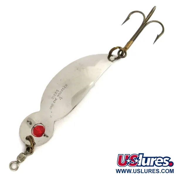 Duidelijk gestempeld in het vernikkelde oppervlak van de achterzijde, identificeert het merkteken "GIBBS ONE EYE WIGGLER 4" dit 28g zware stukje West Coast sportvisserijgeschiedenis. Met een lengte van 10 cm heeft de lepel een schitterend Nikkel / Rood kleurenschema, gecentreerd rond het iconische rode kraaloog dat stevig in de kop van het kunstaas is verankerd. Dit vintage model, aangeduid met productcode 9725, werd geproduceerd door Gibbs vóór 1970 en vertegenwoordigt de robuuste bouw die verzamelaars uit dat tijdperk verwachten. In een staat beoordeeld als 5/5, toont het exemplaar een opmerkelijk goed bewaarde afwerking waarbij de vernikkeling zijn originele reflecterende diepte behoudt. De hardware bestaat uit een heavy-duty dreg bevestigd via een splitring en een wartel aan de neus om betrouwbare prestaties te garanderen tijdens zwaar trollen of verre worpen.