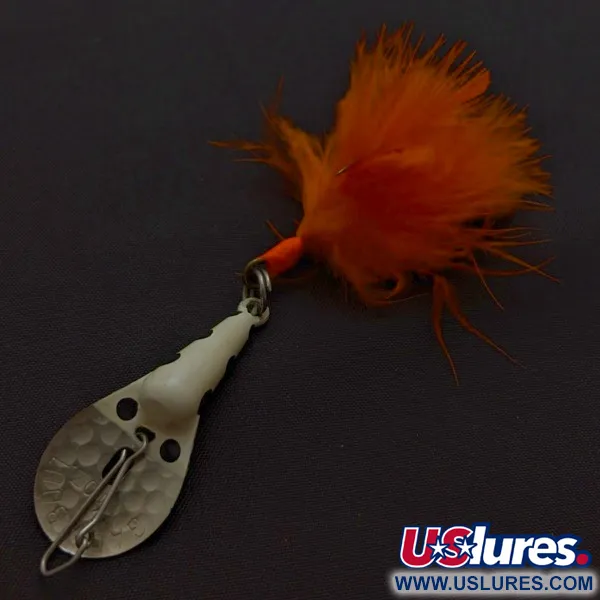 Zwarte stippen op een wit geëmailleerde afwerking zorgen voor een opvallend contrast op het gestanste metalen lichaam van dit 1/4 oz (7 g) kunstaas. Glen Evans gebruikte een kenmerkende tweedelige constructie voor de Gad-About, met een metalen lepelgedeelte aan de voorzijde waarin de merk- en modelnaam zijn gestanst. Aan de achterzijde is een flinke pluk oranje veren met bijpassend oranje draad aan de haak gebonden, waardoor het volle profiel behouden blijft. Met een lengte van 2" (5 cm) blijven de metalen onderdelen glanzend en vrij van oxidatie. Dit exemplaar is in 5/5 conditie, waarbij de lak en de veren er nog net zo uitzien als bij het verlaten van de fabriek.