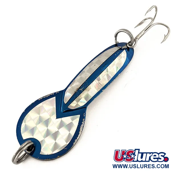 Een diepblauwe voorzijde geaccentueerd door glinsterende zilveren holografische tape kenmerkt deze klassieke lepel van 17 g (3/5 oz). Dit exemplaar, onderdeel van de historische Glen Evans-catalogus onder productcode 13100, is 7 cm (2 3/4") lang en toont het ontwerp dat later door Luhr Jensen populair werd gemaakt. De voorzijde is voorzien van een opvallende diamantvormige prisma-inleg voor maximale zichtbaarheid, terwijl de achterzijde is afgewerkt in hoogglans nikkel met de scherpe en leesbare stempel „GLEN L. EVANS LOCO 3“. Dit kunstaas wordt vaak gebruikt voor het vissen op snoek in ondiep, stilstaand water tot 1 m diepte en is robuust gebouwd voor zowel werpen als trollen. Zowel de kop als de staart zijn uitgerust met splitringen, waarmee een scherpe dreg aan de achterzijde is bevestigd. Dit specifieke item verkeert in 5/5 conditie, waarbij de originele glans op de nikkel- en prismaoppervlakken behouden is gebleven.
