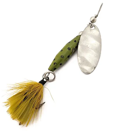 Een klassiek vernikkeld spinnerblad, voorzien van de Glen L. Evans Caldwell, Idaho stempel, kenmerkt dit werpkunstas uit het midden van de vorige eeuw. Met een gewicht van 1/4oz (7g) is de Glen Evans Shyster voorzien van een taps toelopend groen lichaam, gedecoreerd met handmatig aangebrachte zwarte stippen op het frame van 7cm. De achterzijde is uitgerust met een geel bevederde dreg die is bevestigd met een stevige splitring; een ontwerp dat vaak de voorkeur geniet voor het vissen op forel en baars in diverse wateromstandigheden. Geïdentificeerd door productcode 17901, toont dit exemplaar het vakmanschap van de in Idaho gevestigde fabrikant. De staat wordt beoordeeld als 5/5, aangezien de groene verf levendig blijft en het nikkelen blad minimale slijtage vertoont, waardoor de merkstempel goed leesbaar is gebleven. Dit specifieke model maakt gebruik van een verzwaard lichaam om de werpafstand te vergroten zonder dat er extra lood nodig is.
