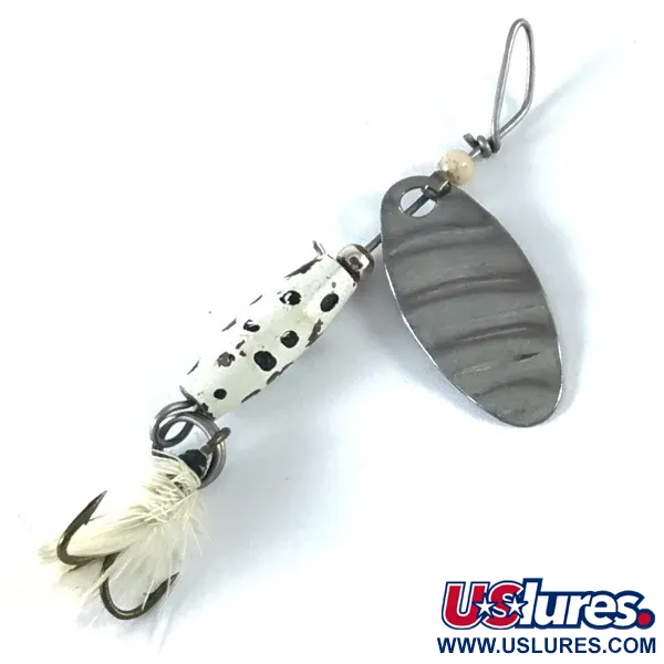 Een opvallend wit lichaam met gedurfde zwarte stippen kenmerkt deze klassieke spinner, een ontwerp dat oorspronkelijk werd geïntroduceerd door de firma Glen Evans. Met een gewicht van 1/8 oz (4 g) en een totale lengte van 2 1/4" (6 cm) beschikt de Shyster over een kenmerkend offset oog dat is ontworpen om het kinken van de lijn te beperken. Dit specifieke exemplaar, met productcode 3661, heeft een zilverkleurig blad met de karakteristieke horizontale ribbels, een kenmerk van de vroege Amerikaanse hengelsportindustrie. De achterste dreg is afgewerkt met witte veren, wat zorgt voor een zachter visueel profiel. Gefabriceerd in de VS, de constructie is nog steeds robuust, en de 5/5 conditie duidt op een uitstekend bewaard gebleven exemplaar met een schone afwerking. In tegenstelling tot veel standaard inline spinners staat deze configuratie onder verzamelaars bekend om zijn vermogen om effectief te werken bij lage inhaalsnelheden in zowel stromend water als in rustige meren.