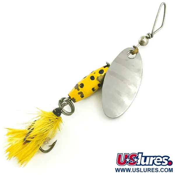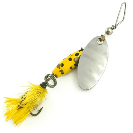 De geel gespikkelde lak op het druppelvormige loodlichaam identificeert deze 4g (1/8oz) Glen Evans Shyster als een authentiek stuk Amerikaanse hengelsportgeschiedenis. Met een lengte van 6 cm (2 1/4") beschikt de spinner over de kenmerkende offset lijnaanhechting die door Glen Evans werd gepionierd voordat het ontwerp werd overgenomen door fabrikanten als Luhr Jensen. Het gepolijste nikkelen blad is duidelijk voorzien van de naam Shyster, gecombineerd met een bijpassende gele verendreg aan de achterzijde. Dit exemplaar toont zijn ouderdom op een nette manier met lichte slijtage aan de lak, wat een conditiescore van 4/5 oplevert. De specifieke gewichtsverdeling is afgestemd op een trage inhaalsnelheid in zowel stilstaand water als stroming, waardoor het blad consistent blijft draaien. Alle onderdelen, van de metalen spacers tot de dregbevestiging, zijn origineel voor productcode 5752.