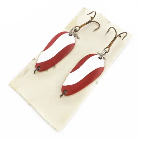 Rode en witte emaille strepen zorgen voor een contrastrijke afwerking op de voorzijde van deze Glen Evans Spoon lepels. Elk kunstaas is 1 1/2" (3,8 cm) lang en weegt 3/16 oz (6 g). De binnenkant van de gestanste metalen body onthult een blank koperen oppervlak, wat zorgt voor een metaalachtige schittering tegenover de geverfde zijde. Onder productcode 24601 bevat deze set twee bijpassende kunstaasjes die ongebruikt zijn. Aan de staart van het druppelvormige profiel is een enkele dreg gemonteerd. Kleine inkepingen van het fabricageproces zijn zichtbaar waar het metaal is gevormd.