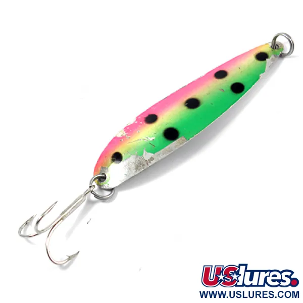 Met een lengte van 10 cm (4") heeft deze Gold Star KF 5H lepel een klassiek regenboogforel-kleurenpalet over een gepolijste metalen basis. Geproduceerd in de VS door Silver Horde / Gold Star, een naam die synoniem staat voor de geschiedenis van het zalmtrollen in het noordwesten van de Grote Oceaan. Dit specifieke exemplaar van 16g (3/5oz) draagt productcode 1973. De bovenkant toont een levendige roze zijstreep die overgaat in een heldergroene rug, geaccentueerd door duidelijke zwarte stippen die kenmerkend zijn voor het regenboogforelpatroon. Met een conditiescore van 4/5 vertoont het geverfde oppervlak wat eerlijk karakter waarbij de zilveren ondergrond zichtbaar is door kleine beschadigingen, wat duidt op vistijd terwijl de lepel goed bewaard is gebleven. De achterkant van het kunstaas onthult een hoogreflecterende zilveren afwerking met een subtiel hexagonaal honingraatschubpatroon om licht te vangen en te weerkaatsen. De lepel is nog steeds uitgerust met de originele hardware, inclusief stevige splitringen en een enkele zilverkleurige dreg.