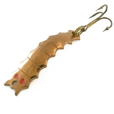 Gesegmenteerde koperen schubben sieren het lichaam van deze unieke lepel in larve-stijl, vervaardigd in de VS. De Al's Goldfish Helgy, productcode 6650, heeft een gebogen profiel dat is ontworpen om waterinsecten na te bootsen. Met een lengte van 4,5 cm (1 3/4") vertoont het metalen lichaam diepe kopertinten, geaccentueerd door twee duidelijke rode stippen bij het bevestigingsoog. Met een gewicht van 5,5 g (3/16 oz) is dit exemplaar een uitstekend voorbeeld van Amerikaanse hengelsportproductie, primair ontworpen voor het werpen in beken of kleinere wateren. Het beslag is in topvorm, met een stevige splitring die een klassieke dreg met bronzen afwerking verbindt. Dit kunstaas verkeert in 5/5 conditie en vertoont een glanzende, gelijkmatige afwerking over het geribbelde oppervlak.