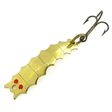 Over de gehele lengte gesegmenteerd om de larvevorm van een hellgrammite na te bootsen, is deze vintage messingkleurige metalen lepel een uniek stukje Amerikaanse hengelsportgeschiedenis. Al's Goldfish produceerde deze Goldfish Helgy, herkenbaar aan productcode 7244, met een kenmerkend gebogen en ingekerfd profiel. Met een lengte van 4,5 cm (1 3/4") heeft het kunstaas twee handgeschilderde rode stippen op de kop die als ogen dienen, net boven het voorste bevestigingsoog. De achterkant van het lichaam is duidelijk gestempeld met "GOLDFISH HELGY", wat de strakke typografie behoudt die typisch is voor de productie van het merk in de VS halverwege de vorige eeuw. Met een gewicht van 4,5 g (3/16 oz) verkeert dit exemplaar in 5/5 conditie, met een helder, reflecterend oppervlak. De montage bestaat uit een enkele dreg met bronzen afwerking, bevestigd via een splitring aan de staart, klaar voor het vissen in rotsachtige beken of vijvers.