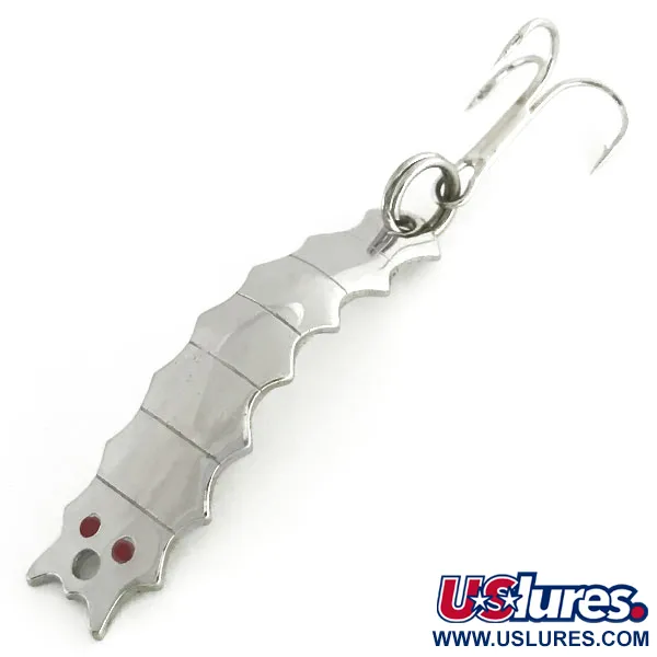 De vernikkelde afwerking zorgt voor een schitterend reflecterend oppervlak bij deze 3/16 oz (4,5 g) Goldfish Helgy, een klassieke Amerikaanse lepel met een gesegmenteerd, insectachtig profiel. Met een lengte van 1 3/4" (4,5 cm) is het lichaam voorzien van een reeks ribbels die het licht vanuit meerdere hoeken vangen, uitlopend in de scherpe "GOLDFISH HELGY" stempeling op de achterkant. De kop van het kunstaas is afgewerkt met twee kleine, felrode ogen en een schoon bevestigingsoog, terwijl de staart is uitgerust met een stevige splitring en een bijpassende nikkelen dreg. Met productcode 8621 verkeert dit exemplaar in 5/5 conditie, met een gladde en onberispelijke afwerking over het gehele oppervlak. Het ontwerp bootst de look van een helgrammite na, een belangrijk voedsel voor veel zoetwatersoorten.