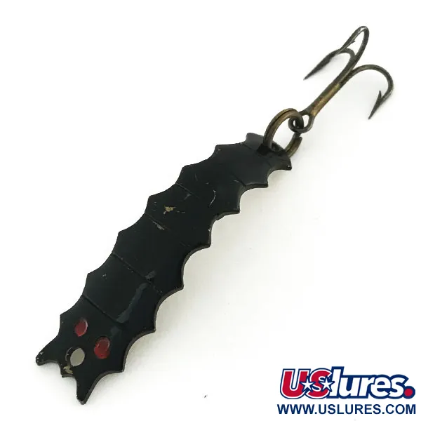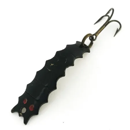 Rode ogen knallen tegen het diepzwarte lichaam van dit 3/16oz (4,5g) exemplaar van Al's Goldfish. De Helgy, aangeduid met productcode 8622, is een apart in de VS gemaakt kunstaas dat de gesegmenteerde silhouet van een Hellgrammite-larve nabootst. Met een lengte van 1 3/4" (4,5cm) is het een compact instrument met een stevige dreg verbonden door een messingkleurige splitring. De afwerking is opmerkelijk intact gebleven en verdient een conditiescore van 5/5 vanwege de schone oppervlakken en goed bewaard gebleven geverfde details. Een subtiele gouden ondertoon is zichtbaar waar het licht op de ribbels van het metalen lichaam valt, wat getuigt van het vakmanschap dat van dit klassieke merk wordt verwacht. Het hang- en sluitwerk vertoont een zachte verouderde tint, maar blijft structureel gezond voor display of voorzichtig vissen in beken.