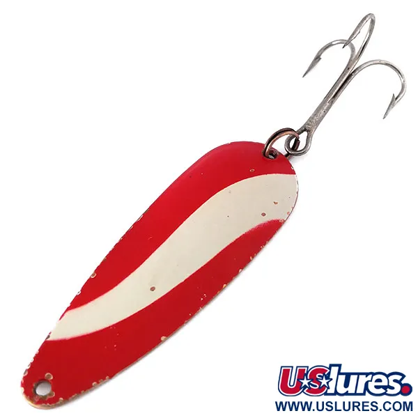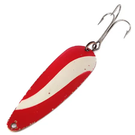 De koperen achterkant van dit exemplaar is voorzien van een duidelijke 'Gypsy King 0'-stempel, wat het identificeert als een klassieke Weller-creatie uit de USA. Met een lengte van 6 cm (2 1/4") en een gewicht van 11 g (2/5 oz), vertoont het metalen lichaam van het kunstaas een traditioneel rood-wit diagonaal gestreept patroon op de bolle zijde. Deze kleurkeuze was een vaste waarde voor sportvissers uit het midden van de eeuw die op zoek waren naar een hoge zichtbaarheid. De achterkant onthult de originele koperen afwerking, die lichte ouderdomssporen vertoont die passen bij de conditiescore van 4/5. Een enkele dreg is aan de achterzijde bevestigd met een splitring, terwijl de neus is voorzien van een zuiver bevestigingsgat. De constructie van deze lepel, herkenbaar aan productcode 10511, benadrukt het duurzame metaalwerk dat typisch is voor ouder Amerikaans hengelsportmateriaal.