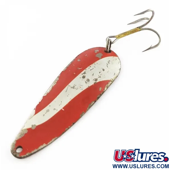 Met een lengte van precies 6 cm (2 1/4") is deze lepel het Gypsy King 0-model van Weber, een merk met een diepe historie in de Amerikaanse hengelsport. De afwerking bestaat uit een opvallend diagonaal rood-wit gestreept patroon op een nikkelkleurige basis, specifiek gecatalogiseerd onder productcode 24209. Met een gewicht van 11g (2/5oz) vertoont het kunstaas zichtbare gebruikssporen met diverse lakschades en krassen op de body, wat resulteert in een conditiescore van 4/5. De constructie is voorzien van een druppelvormig metalen blad met een gestanst bevestigingsoog en een stevige dreg die aan de achterzijde met een robuuste splitring is bevestigd. Dit in de VS vervaardigde kunstaas beschikt nog over het originele beslag, inclusief de forse metalen dreg.