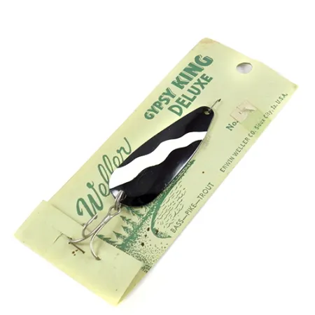 Een opvallende witte golvende streep loopt over het diepzwarte emaille van de bolle zijde van deze klassieke lepel. Met een lengte van 6 cm (2 1/4") en een gewicht van 11 g (2/5 oz), blijft deze Weller Gypsy King 0, herkenbaar aan productcode 2800, bewaard op de originele dealerkaart van de Erwin Weller Co. uit Sioux City, Iowa. Dit Deluxe-model heeft een glanzende vernikkelde achterzijde en is ontworpen voor het vissen op baars, snoek en forel. Het exemplaar is ongebruikt en verkeert in de staat waarin het decennia geleden de fabriek verliet. De vintage kaart toont het iconische cursieve Weller-logo en groene graphics van een meer, typerend voor Amerikaans visgerei uit het midden van de vorige eeuw. Een scherpe dreg is aan de achterzijde gemonteerd, terwijl een eenvoudige draadbevestiging wijst op het gebruik voor werpend vissen of trollen.