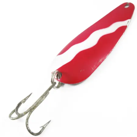 Rood en wit golvend email siert de voorzijde van deze 6 cm (2 1/4") lepel, een ontwerp dat de Weller-reeks al generaties lang definieert. Met een gewicht van 11 g (2/5 oz) heeft de GYPSY KING 0 een gepolijste nikkelen achterzijde waar de modelnaam duidelijk in het metaal is gestanst. Dit specifieke item, gecatalogiseerd onder productcode 3450, verkeert in een 4/5 conditie en heeft zijn originele glans behouden met slechts lichte gebruikssporen op de vernikkeling. Het beslag bestaat uit een splitring en een vintage dreg, die beide het karakter tonen dat verwacht mag worden van een goed onderhouden kunstaas uit de USA. Het glanzende metaal op de achterkant vormt een scherp contrast met het opvallende geverfde golfpatroon op de voorkant van de lepel.