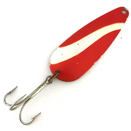 In de glanzende vernikkelde onderzijde is de naam « Gypsy King » gestempeld, wat deze 2 1/4" (6 cm) lepel kenmerkt als een authentiek stuk Weller-geschiedenis uit de USA. Het kunstaas, geïdentificeerd door productcode 8509, is aan de bovenzijde afgewerkt met een traditioneel rood-wit diagonaal streeppatroon. Met een gewicht van 2/5 oz (11 g) is het een robuuste optie voor het werpen nabij structuren of trollen in open water. Het beslag is in uitstekende staat, voorzien van een stevige dreg. Dit exemplaar is beoordeeld met 5/5, met zeer goed geconserveerde verf en een schoon metalen oppervlak. Het oog voor de lijn aan het smalle uiteinde is zuiver door het massieve metalen lichaam geboord.