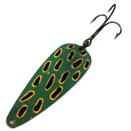 Met een gewicht van 17 g (3/5 oz) vertoont deze vintage lepel uit de VS een contrastrijk Frog-patroon dat typerend is voor die tijd. Met een lengte van 7 cm (2 3/4") heeft de metalen body een diepgroene voorkant met geelgerande zwarte stippen, terwijl de achterkant is afgewerkt in felgeel met eenvoudige zwarte stippen. Deze specifieke Gypsy King 1, geregistreerd onder productcode 10334, heeft een conditiescore van 4/5 en vertoont wat lakslijtage en veroudering die karakter toevoegen zonder de constructie te benadelen. Weller kunstaas staat bekend om dit soort custom-style afwerkingen, en de zware dreg suggereert dat hij ontworpen is voor serieuze zoetwaterrovers. Het beslag vertoont wat verdonkering door de tijd maar blijft structureel in orde, stevig bevestigd aan het taps toelopende uiteinde van de druppelvormige body. Een enkel oog aan de neus van de lepel dient als bevestigingspunt voor werpen of trollen.