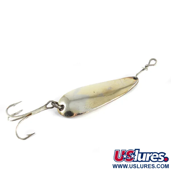 Een gewicht van 12,5 g (2/5 oz) zorgt ervoor dat deze Hagen's lepel snel de gewenste diepte bereikt bij het werpen in stromend water. Direct in het metaal aan de holle zijde is "HAGEN BAIT CO. MILW. WIS." gestempeld, een verwijzing naar de productie in Milwaukee, VS. Het vergulde lichaam is 5 cm (2") lang en vertoont de normale gebruikssporen van een 3/5 conditie, waarbij het oppervlak vele worpen heeft gemaakt. De montage bestaat uit een klassieke dreg aan een splitring en een speldwartel aan de neus voor een veilige lijnverbinding. Deze lepel, bekend onder productcode 1549, heeft een strak en eenvoudig profiel dat is geoptimaliseerd voor duurzaamheid tijdens lange visdagen.