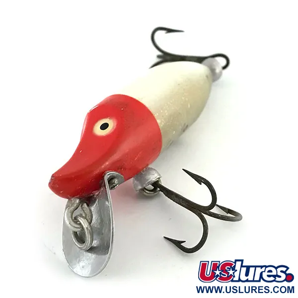 Een opvallende rode kop contrasteert scherp met het roomwitte lichaam van deze 7 g (1/4 oz) Heddon River Runt Tiny Floating, een kleurenpatroon dat sinds het debuut van het model in 1935 zijn status als Amerikaans icoon heeft bevestigd. Met een lengte van 6 cm (2 1/4") vertoont dit exemplaar, herkenbaar aan productcode 8751, de klassieke geschilderde ogen met kenmerkende gele ringen en zwarte pupillen. De hardware bestaat uit een kenmerkende metalen duiklip en twee sets scherpe dreggen, één op de buik en één aan de staart. De staat van de afwerking is uitzonderlijk en verdient een 5/5-beoordeling vanwege de levendige kleuren en structurele integriteit. De constructie van deze in de VS gemaakte plug weerspiegelt het robuuste vakmanschap dat men van een vintage Heddon-item verwacht, waarbij de bevestiging van de metalen lip stevig en onbeschadigd is gebleven. Verzamelaars zullen de conservering van de verf waarderen, met name de vloeiende overgang tussen de felle rode voorkant en het parelwitte lichaam.