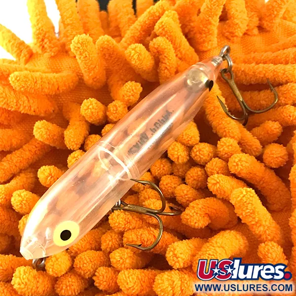 Deze Heddon Zara Puppy, voorzien van vette zwarte belettering op de transparante plastic flank, is een verfijnde versie met een kleiner profiel uit de legendarische walking-bait serie. Met een lengte van 3 1/4" (8 cm) en een gewicht van exact 1/4 oz (7 g), is dit exemplaar een ideale keuze voor het nabootsen van kleine aasvis. De transparante kleurstelling accentueert de interne constructie en toont het achterin geplaatste koperen gewicht en de eenvoudige interne mechanica onder opvallende gele ogen met grote zwarte pupillen. Geïdentificeerd door productcode 6483, behoudt het kunstaas zijn originele hardware met twee buik- en staartdreggen in 5/5 conditie. Als topwater kunstaas is het gebouwd voor de klassieke "walk the dog" cadans, wat zorgt voor een ritmische zijwaartse beweging op het wateroppervlak. Deze in de USA gemaakte klassieker heeft een zeer schone afwerking over het gehele transparante lichaam.