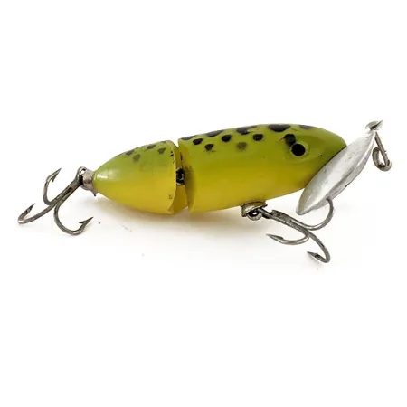 Een klassiek kikkerpatroon met duidelijke zwarte vlekken op een gele basis bedekt het 5,5 cm (2 1/4") gelede lichaam van deze vintage crawler. Met een gewicht van 7 g (1/4 oz) werd dit exemplaar geproduceerd voor Herter's (productcode 11842) en stamt het uit het naoorlogse tijdperk in bezet Japan. De constructie bestaat uit een tweedelig houten of kunststof lichaam verbonden door een stevig metalen scharnier, gecombineerd met een grote, gepolijste metalen kom-lip ontworpen voor oppervlaktevissen. Beide dreggehaken zijn stevig bevestigd via traditionele oogjes, wat een uitstekende conditie van 5/5 weerspiegelt. De lak is bijzonder goed bewaard gebleven op beide segmenten, wat de productiekwaliteit van Japanse importproducten uit deze specifieke historische periode aantoont. Verzamelaars zoeken vaak naar dit specifieke Herter's-merk in combinatie met het kenmerkende brede lipontwerp dat typerend is voor oppervlaktekunstaas uit het midden van de vorige eeuw.
