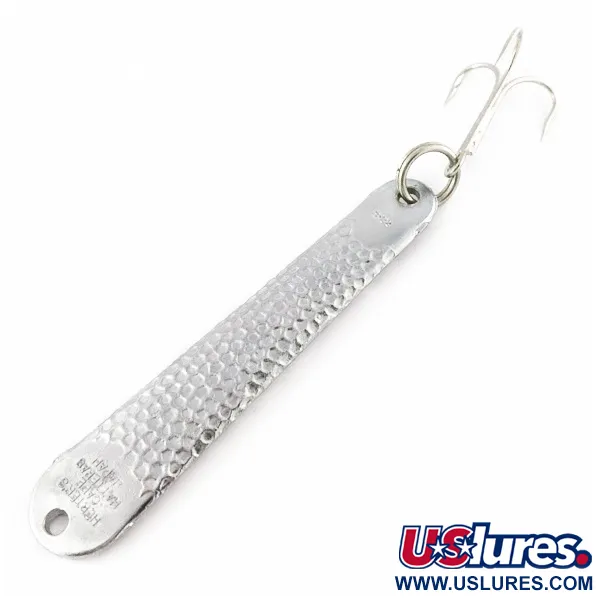Met een gewicht van 1 1/2 oz (42g) is deze zware nikkelen lepel gebouwd voor serieuze dieptes en zwaar zoutwatergebruik. Met een lengte van 10 cm (4") is het lichaam voorzien van een kenmerkende gehamerde afwerking die bedoeld is om licht te vangen, overgaand in een glad, gestempeld deel aan de basis. Dit specifieke exemplaar, herkenbaar aan productcode 24356, stamt uit het tijdperk waarin de Amerikaanse firma Herter's Inc. hoogwaardig materiaal uit Japan importeerde voor hun legendarische postordercatalogi. De aanduiding Cape Hatteras verwijst naar de ruige kustwateren van North Carolina, wat het ontwerp voor de visserij op grote roofvissen benadrukt. De vernikkeling is opmerkelijk schoon, wat een conditiescore van 5/5 oplevert, waarbij de gestempelde identificatie "Herter's Cape Hatteras Japan" scherp en zeer goed leesbaar is gebleven. De lepel is uitgerust met een stevige splitring en een glanzende dreg aan de staart, terwijl de kop is voorzien van een strak boorgat voor de lijnaansluiting.