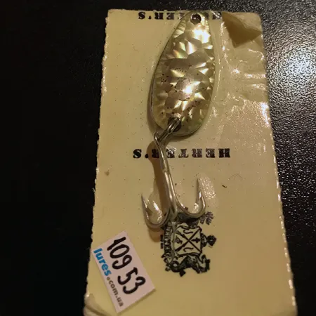 Met een gewicht van 3/16 oz (6 g) maakt de in Japan geproduceerde Herter's Crystal gebruik van een veelzijdig gehamerd oppervlak om een glinsterende visuele aanwezigheid te creëren. De lepel, geregistreerd onder productcode 10953, heeft een lengte van 1 1/2" (3,5 cm) en behoudt de heldere, schone afwerking die kenmerkend is voor een ongebruikt exemplaar. Het ontwerp van de lepel, vaak gebruikt voor het vissen op forel of baarsachtigen, vertrouwt op zijn metalen facetten om licht uit alle hoeken te reflecteren. Hij zit nog steeds op de originele 'Herter's' kaart, waarop het iconische bedrijfslogo en de vintage typografie te zien zijn. De hardware bestaat uit een enkele zilverkleurige dreg, verbonden door een stevige splitring, die beide geen tekenen van ouderdom of slijtage vertonen. Omdat hij is geclassificeerd als conditie 6, is het kunstaas ongebruikt en ziet hij er nog precies zo uit als toen hij decennia geleden de fabriek verliet.