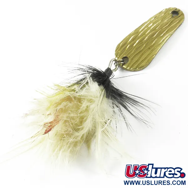 Met een gewicht van 1/4 oz (8 g) weerspiegelen de klassieke proporties van deze lepel de praktische ontwerpfilosofie die de catalogus van George Leonard Herter tot een vast onderdeel maakte voor sportvissers uit het midden van de eeuw. De vergulde laag heeft een golvende, gehamerde textuur aan de bolle kant, terwijl de binnenzijde glad gepolijst is en het duidelijke stempel "HERTER'S HUDSON BAY SPOON" draagt. Met een lengte van 1 1/2" (4 cm) is het kunstaas afgewerkt met een dreg met veren, waarbij witte en zwarte vezels het profiel van het aas verlengen. Dit specifieke exemplaar, geïdentificeerd met productcode 3493, werd vervaardigd in Japan in een tijdperk waarin Herter's robuuste componenten uit het buitenland haalde om aan de eisen van Amerikaanse vissers te voldoen. Het metaal vertoont lichte ouderdomsslijtage, wat het een degelijke 4/5 conditiebeoordeling oplevert, maar het blijft een schoon en functioneel stukje geschiedenis. Het werpen van deze lichtgewicht lepel was een favoriete techniek voor forel en baarsachtigen, vertrouwend op de schittering van de gouden afwerking en de subtiele, levensechte kwaliteit van de versierde haak.