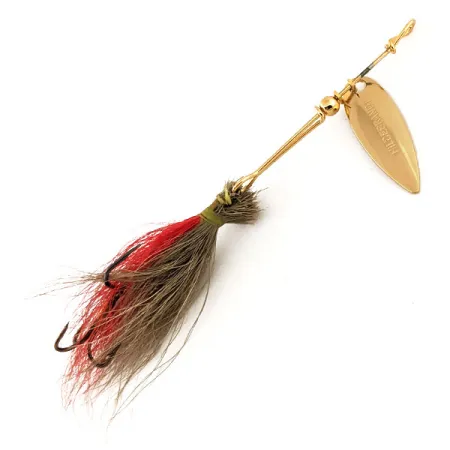 De iconische naam Hildebrandt staat duidelijk gestempeld op het gouden wilgenblad-blad, wat deze nauwkeurige 1,2g (3/64oz) ultralichte spinner identificeert. Het metalen frame is glanzend en recht, voorzien van een kleine gouden kraal die dient als een soepele lager voor de beugel van het blad. Een mix van natuurlijke bruine en rode veren is handgebonden rond de dreg, wat zorgt voor het subtiele visuele profiel dat typisch is voor vintage forel- en baarsaas. Onder productcode 12549 is dit exemplaar een voorbeeld van de hoogwaardige plating- en assemblagenormen van het merk. De gouden afwerking van de as en onderdelen is uitstekend bewaard gebleven. Deze spinner is ongebruikt, zonder slijtage aan de haakpunten of aanslag op de metalen oppervlakken.