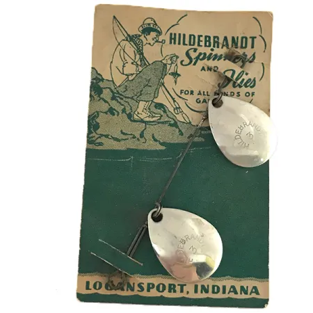 Vernikkelde druppelvormige bladen, gestempeld met het iconische «HILDEBRANDT 3» merk, benadrukken het functionele vakmanschap van deze vintage terminal tackle. Met een gewicht van 3/32oz (3g) blijft deze configuratie met dubbele spinner gemonteerd op de originele geïllustreerde winkelkaart, die de oorsprong in Logansport, Indiana vermeldt. De achterkant van de verpakking identificeert dit als een «echte No. C1» HILDEBRANDT SPINNER (No. C Idaho Spinner), specifiek ontworpen om te worden gevist in combinatie met traditionele vliegen voor alle roofvissen. Gecatalogiseerd onder productcode 8519, beschikt het exemplaar over twee glanzende bladen op een schone metalen as. De afwerking van de metalen componenten is uitzonderlijk goed bewaard gebleven en reflecteert het licht precies zoals decennia geleden in de VS. Dit exemplaar toont de vroege 20e-eeuwse benadering van kunstaas met meerdere bladen, waarbij eenvoudige mechanische verbindingen worden gebruikt om de bladen vrij rond de centrale as te laten draaien. Het exemplaar is in 5/5 conditie, met behoud van zijn originele glans en structurele integriteit, terwijl de kaart dient als een historisch verslag van de wortels van het merk in het Midden-Westen.
