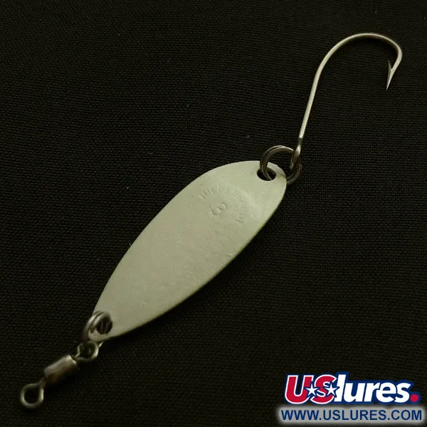 Met een gewicht van een verfijnde 1,9 g (1/16 oz) is deze druppelvormige lepel een klassiek ultra-light model uit de VS. De afwerking van deze specifieke Little Shaver 3, herkenbaar aan productcode 23507, is uitgevoerd in een tweekleurig parelmoer/groen patroon, met aan de ene kant een subtiele witte parelmoerglans en aan de andere kant een fel neongroene kleur. Het lepeltje heeft een lengte van 3,5 cm en is voorzien van een enkele haak met 'bait-keeper', bevestigd via een stevige splitring en een kleine wartel aan de voorzijde. De achterkant van het blad is duidelijk gestempeld met de fabrikantnaam Hildebrandt en maatnummer 3. Dit kunstaas bevindt zich in een 5/5 conditie, met een schone, glanzende afwerking van het metaal en scherpe, originele onderdelen. Ontworpen voor nauwkeurige worpen in beken of vijvers, is de montage met een enkele haak bijzonder geschikt voor het vissen op forel en kleine baarsachtigen, terwijl de kans op vastlopen wordt geminimaliseerd.