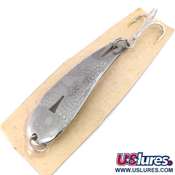Met een opvallende afwerking van gehamerd nikkel reflecteert dit klassieke kunstaas het licht over zijn gesmede, massieve roestvrijstalen body. R.L. Hopkins begon deze in 1949 te maken om te voldoen aan de vraag naar een ver werpende lepel die bestand was tegen de corrosieve omstandigheden van het zoutwaterenvissen. De uitrusting omvat een originele Mustad dreg die is bevestigd met een roestvrijstalen splitring, wat duurzaamheid garandeert bij het vissen op grotere vissoorten. Het vinden van een Hopkins Hammered Spoon (productcode 10618) in ongebruikte staat is een hoogtepunt voor elke verzamelaar, vooral omdat deze nog bevestigd is aan de originele kartonnen achterkant met instructies. Dit exemplaar is 2 1/4" (6 cm) lang en weegt 1/4 oz (7 g). Zoals vermeld op de vintage verpakking, is het ontwerp geschikt voor werpen, jiggen of ijsvissen, bedoeld om naar de bodem te dwarrelen of op verschillende dieptes te worden binnengevist. Deze lepels zijn trotse voorbeelden van Amerikaanse productie.