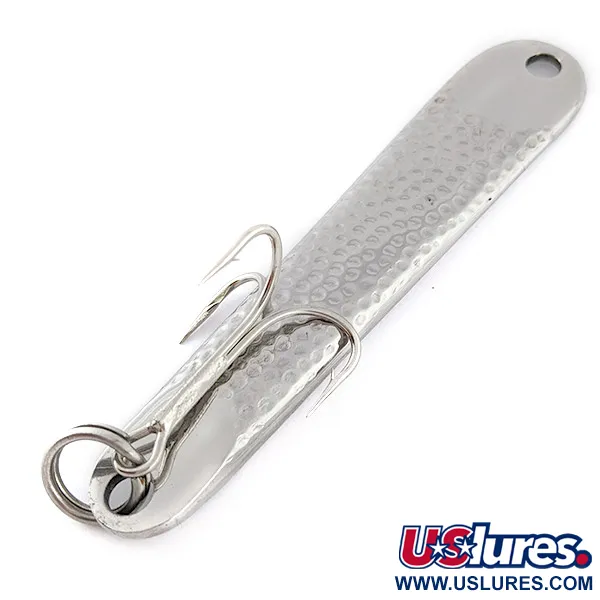 Gehamerde nikkelen afwerking kenmerkt het oppervlak van deze 60g zware metalen lepel, een ontwerp dat voortkwam uit de zoektocht van R.L. Hopkins in 1949 naar een duurzaam werp-aas voor zout water. Met een lengte van 10,5 cm is de Hopkins No=Eql 3 ontworpen met een compact profiel om snel diep water te bereiken. De body is voorzien van het duidelijke stempel 'HOPKINS NO-EQL @ 3 1/2' op de gestructureerde zijde, wat helpt om lichtreflecties te breken. Zowel de dreg als de stevige splitring verkeren in 5/5 staat en zien er glanzend en schoon uit. Gecatalogiseerd onder productcode 22591, maakt dit kunstaas gebruik van een enkel bevestigingsoog bij de taps toelopende neus. De constructie is primair gericht op werp- en jigtoepassingen waarbij gewicht en corrosiebestendigheid centraal staan.