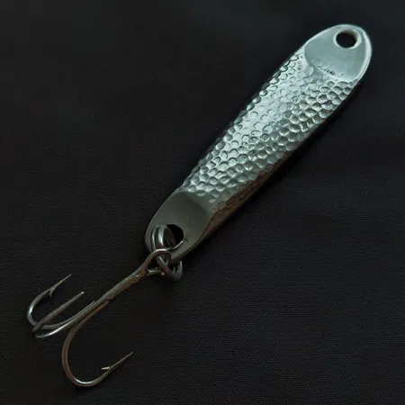Een zware vernikkeling over een gehamerd oppervlak kenmerkt deze Hopkins Shorty 225, een ontwerp dat ontstond in 1949 toen R. L. Hopkins zocht naar kunstaas dat bestand was tegen zware zoutwateromstandigheden. Met een gewicht van 2 oz (56 g) is dit massief metalen kunstaas ontworpen voor extreme werpafstanden en weerstand tegen grote trofee-vissen. De gehamerde textuur zorgt voor een opvallend visueel profiel over het 9 cm lange lichaam, dat specifiek is gebouwd als pilker in plaats van een standaard lepel. Duidelijk gemerkt met de naam en herkomst uit de VS, verkeert exemplaar 21339 in 5/5 conditie met heldere, reflecterende oppervlakken en robuust beslag. Hoewel het effectief is voor trollen, wordt het voornamelijk gebruikt als jig voor soorten zoals snoekbaars of baars, waarbij aanbeten het vaakst voorkomen tijdens het afzinken.