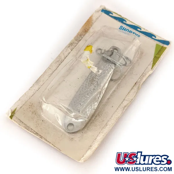 Een gehamerde nikkelafwerking zorgt voor een gestructureerd, reflecterend oppervlak op dit 14g (1/2oz) massief metalen kunstaas. Geproduceerd door de Hopkins Fishing Lures Co. uit Norfolk, Virginia, blijft deze Shorty 45 (productcode 11240) een essentieel hulpmiddel voor zowel zout- als zoetwaterroofvissen. Het lichaam is 5,5 cm (2 1/4") lang en is voorzien van de aanduiding "Shorty" die direct in het metaal is gestanst, zodat de merkidentiteit jarenlang gebruik overleeft. Dit exemplaar is ongebruikt en zit nog in de originele winkelverpakking, die ouderdom vertoont door enige verdonkering en slijtage van het karton, terwijl de lepel zelf een schone fabrieksglans behoudt. De standaard hardware omvat een zware splitring en een dreg, bedoeld voor technieken zoals verticaal vissen of verre worpen. Gedetailleerde instructies voor trollen en jiggen op verschillende dieptes staan op de achterkant van de verpakking, wat de veelzijdigheid van deze Amerikaanse klassieker benadrukt.