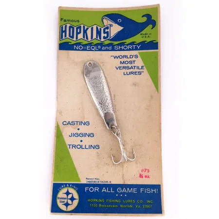 Gehamerde nikkelen schubben vangen het licht over de 6,5 cm (2 1/2") lengte van deze klassieke metalen jig. Met een gewicht van 21 g (3/4 oz) blijft de Hopkins Shorty 75, herkenbaar aan productcode 10069, een favoriet voor liefhebbers van Amerikaans vakmanschap uit de VS. Dit specifieke exemplaar is ongebruikt en bevindt zich in de originele vintage verpakking met een conditiescore van 6. Het kenmerkende gedimde oppervlak van het lichaam is ontworpen om de schittering van aasvis na te bootsen, gecombineerd met een stevige dreg bevestigd via een splitring. Volgens de originele verpakking is hij ontwikkeld als een veelzijdige keuze voor werpen, jiggen of trollen in zowel zoet als zout water. De kaart vermeldt het model als de #75 en benadrukt het gebruik van roestvrij staal, wat de duurzaamheid onderstreept die Hopkins een bekende naam maakte in Norfolk, Virginia.