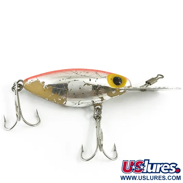 Met een lengte van precies 7 cm (2 3/4") vertegenwoordigt dit exemplaar een klassiek tijdperk van Amerikaanse kunstaasproductie uit de pre-Rapala catalogus van Storm. De zilveren chroomafwerking op de body vertoont een eerlijk karakter waar de plating in de loop der tijd dunner is geworden en de tan-kleurige onderlaag onthult, wat resulteert in een conditiescore van 4/5. Een levendige fluorescerende rode rug zorgt voor hoge zichtbaarheid tegen de zilveren flanken, aangevuld met grote geel geverfde ogen met zwarte pupillen. Uitgerust met een kenmerkende overgedimensioneerde metalen duiklip en geïntegreerde speldwartel, is dit 12g (2/5oz) kunstaas ontworpen om dieptes van 1,5m tot 4m (5ft - 13ft) te bereiken. Aangeduid met productcode 4454, is dit ontwerp een vaste waarde voor sportvissers die zich richten op snoek, snoekbaars en baars via trollen of werpen. De hardware is functioneel, met twee dreggetjes op de buik en staart, bevestigd met originele splitringen.