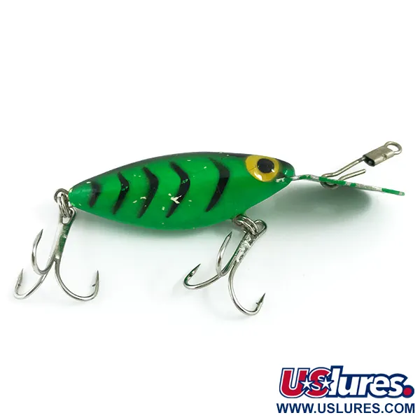 Met een gewicht van 6,5 g (1/4 oz) vertegenwoordigt deze vintage houten Hot'N Tot Thin Fin het klassieke tijdperk van Storm voor de overname door Rapala. Met een lengte van precies 5 cm (2") beschikt dit exemplaar over een felgroene basis met opvallende zwarte strepen op de flanken, een patroon dat is ontworpen voor het vissen op diep water op baars, snoekbaars en snoek. De grote gele ogen met zwarte pupillen zorgen voor een duidelijk visueel focuspunt. De grote, geïntegreerde metalen duiklip is in dezelfde kleur als het lichaam geverfd en vertoont lichte gebruikssporen van eerdere sessies waarbij dieptes van 1,5 m tot 4 m (5 ft - 13 ft) werden bereikt. Deze drijvende plug, gemaakt in de USA onder productcode 4457, verkeert in een conditie van 4/5, met minimaal verfverlies op de metalen lip terwijl de graphics op de body opmerkelijk scherp zijn gebleven. Twee zilverkleurige dreggen zijn stevig bevestigd via heavy-duty bevestigingsogen. Het metalen bevestigingsoog voor de lijn bevindt zich direct op de lip om de plug te stabiliseren tijdens het werpen of trollen.