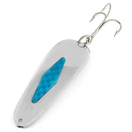 Met een lengte van 9 cm (3 1/2") toont deze in de VS vervaardigde lepel het kenmerkende profiel waar Miller om bekend staat. De vernikkelde body van de ITHACA 75 sleepplepel is voorzien van een opvallende blauwe inleg met ruitpatroon die scherp contrasteert met het gepolijste metaal. Met een gewicht van 10 g (1/3 oz) is het kunstaas ontworpen met een brede, afgeronde achterzijde en een smallere kop, een vorm die ideaal is voor het traditionele sleepvissen. Aan de achterkant is het schone, reflecterende oppervlak goed behouden, wat de vloeiende rondingen van het gestanste metaal accentueert. De hardware bestaat uit een robuuste, zilverkleurige dreg aan een stevige splitring; beide verkeren in uitstekende conditie. Voor een item met productcode 22642 is de staat een opmerkelijke 5/5, met behoud van de originele glans en zonder noemenswaardige gebruikssporen. Dit specifieke Ithaca 75-model is een waardevolle vondst voor wie de regionale Amerikaanse kunstaasfabrikanten uit de regio rond Ithaca, New York, bestudeert.
