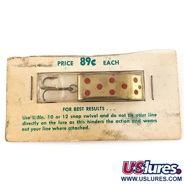 Rode stippen op een gepolijst messing lichaam kenmerken het uiterlijk van deze Jake's Lures Lil Jake. Met een gewicht van 9 g (1/3 oz) en een lengte van 3,5 cm (1 1/2") is dit in de USA gemaakte kunstaas ontworpen met een unieke vorm die de eigenschappen van een spinner en een lepel combineert. Het is in ongebruikte staat, bewaard in de originele blisterverpakking op de fabriekskaart. De vintage kaart toont nog de originele prijs van 89 cent en geeft specifiek technisch advies: gebruik een speldwartel nr. 10 of 12 om lijnkinken te voorkomen en de actie te garanderen. Dit exemplaar met productcode 11197 is voorzien van een scherpe dreg die met een splitring is bevestigd.